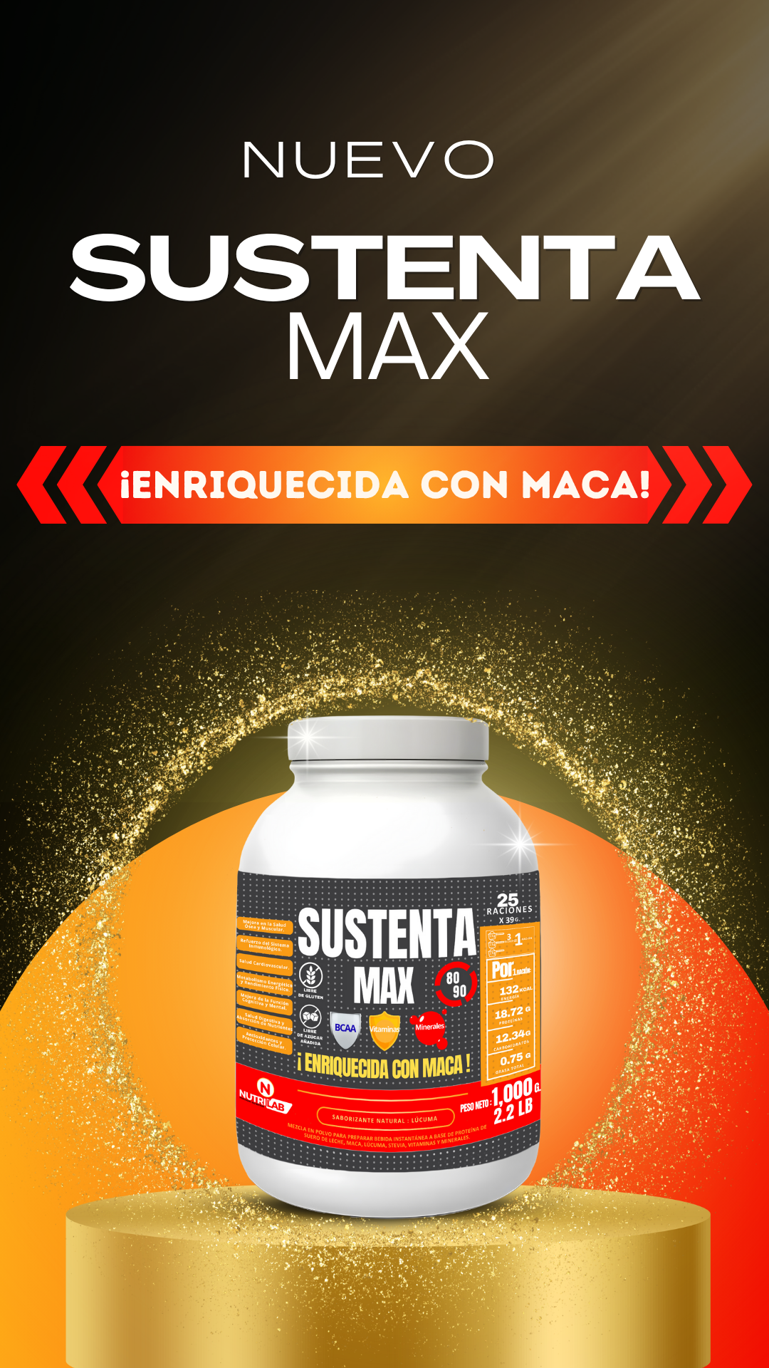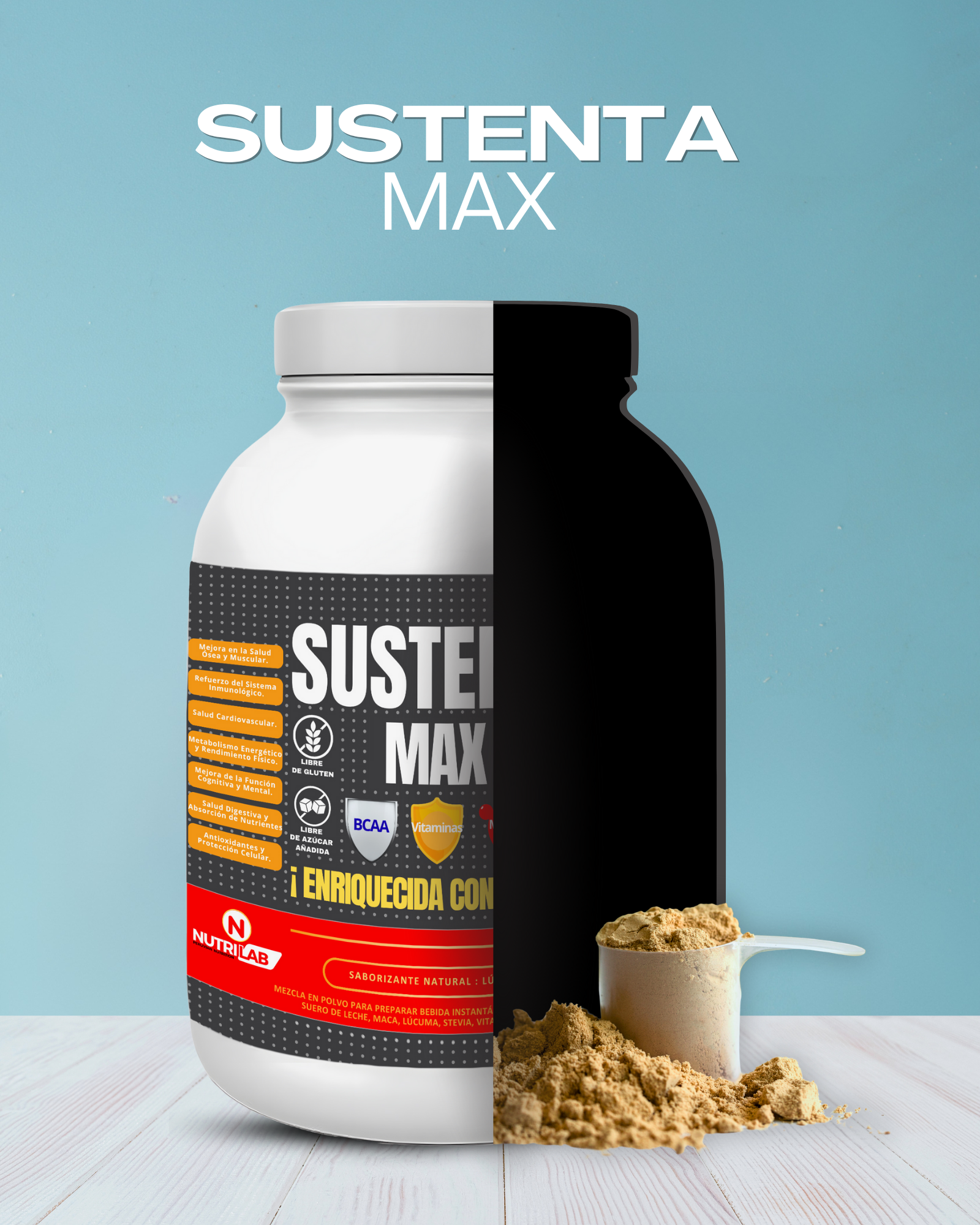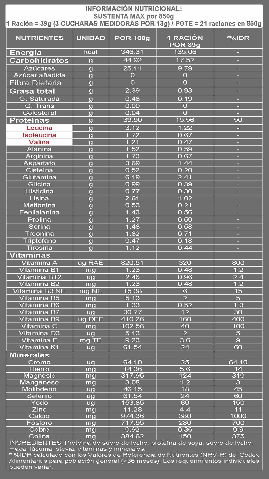 En cada ración de 39 g de SUSTENTA MAX, se aporta aproximadamente 135 kcal de energía, derivadas de 15,6 g de proteína de alto valor biológico, que combinan proteína de suero de leche y proteína de soya para favorecer la síntesis proteica y mantener masa muscular. Además, entrega unos 17,5 g de carbohidratos totales de los cuales 7.73 son carbohidratos complejos provenientes de fuentes funcionales como la lúcuma y la maca, y 9.79 son azúcares naturales provenientes del suero de la leche (sin azúcar añadida), junto con 0,9 g de grasa total, lo que garantiza una carga lipídica controlada. En cuanto a aminoácidos esenciales, provee un aporte significativo de BCAA (leucina + isoleucina + valina), alrededor de 2,36 g, que refuerzan la recuperación muscular y la señalización anabólica.