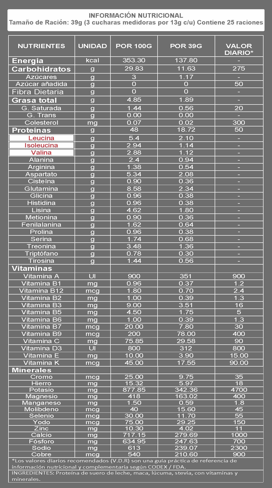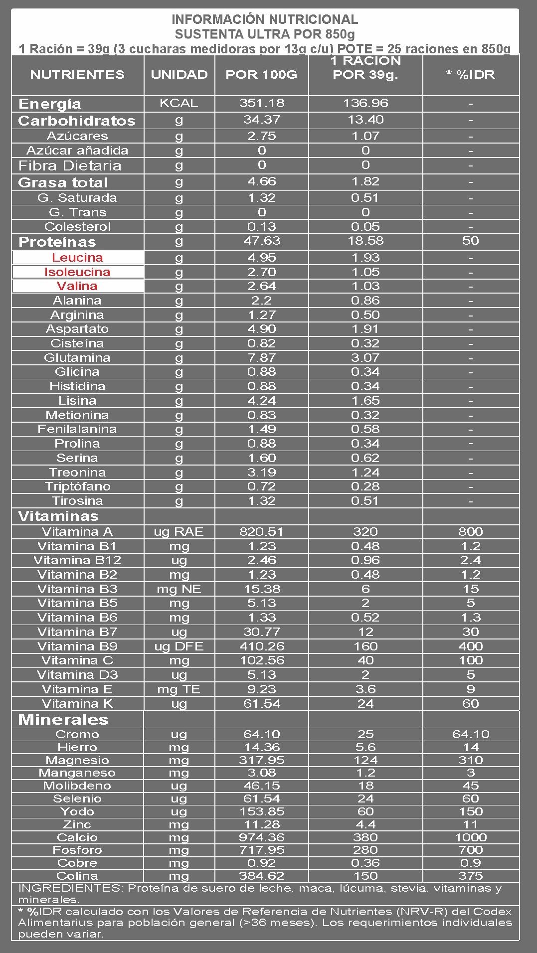 Cada ración de SUSTENTA ULTRA aporta 139 kcal, con 18,7 g de proteína de alto valor biológico, 12.85 g de carbohidratos totales con solo 1,17 g de azúcares naturales provenientes del suero de la leche (sin azúcar añadida), y 1,95 g de grasa total. Desde el perfil aminoacídico, entrega BCAA 4.38 g (leucina 2.11 g, isoleucina 1,15 g, valina 1,12 g), además de glutamina 3,35 g y un conjunto de aminoácidos esenciales y condicionales (lisina 1,81 g; treonina 1,36 g, etc.).